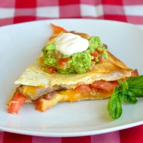 No need for frying with these crispy quesadillas which can use leftover steak, chicken or pork. Just brush the outsides of the tortillas with a little oil and crisp them to golden brown under the broiler.