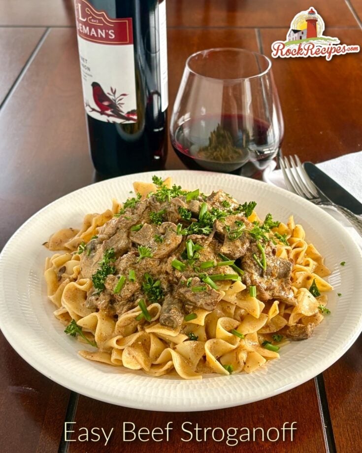 Beef Stroganoff photo of one serving on a white plate with title text and logo added for Pinterest and social media.
