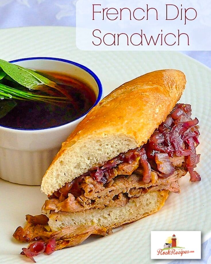 The keys to this incredible French Dip Sandwich are the slowly oven simmered, rich beef broth made from roasted bones, thinly sliced steak & red onion jam.