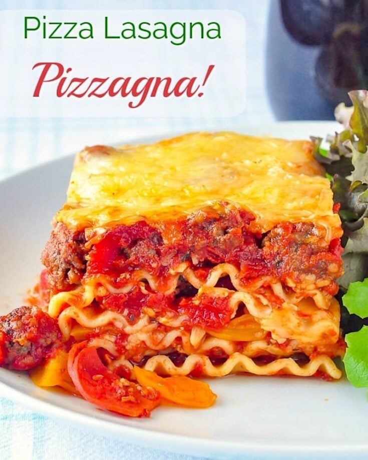 Pizza Lasagna. Pizzanga! A sure crowd pleaser, especially with the kids which combines two of their favourite meals. There are no rules with this recipe, just use your own favourite pizza toppings or what you have on hand.