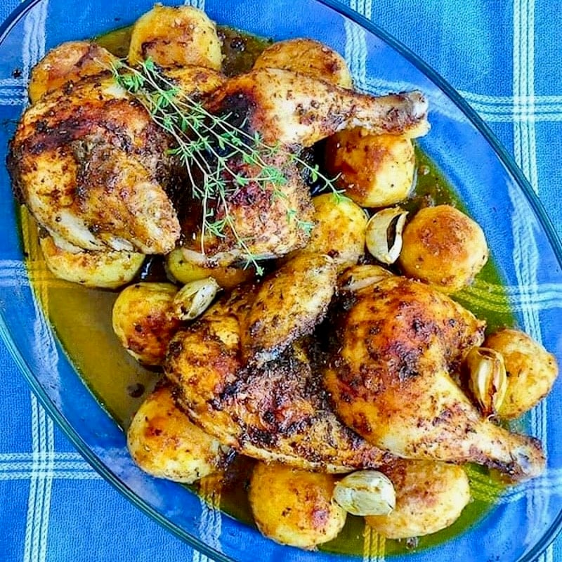 Smoked Paprika Chicken and Potatoes. In about 90 minutes you can serve this amazing comfort food meal. You’ll love this succulent roasted smoked paprika chicken with thyme on a bed of crispy roasted potatoes.