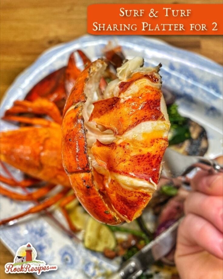 - Let steak rest before slicing it and arranging and a platter with the grilled lobster and vegetables.